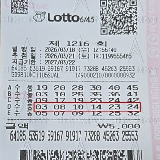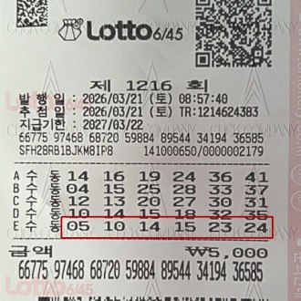 로또클릭 1216회차 동행복권 당첨번호2026-03-21 3101415232425 1등 2,148,654,000원 당첨자수 14명 2등 57,626,736원 당첨자수 87명 3등 1,576,085원 당첨자수 3181명 동행복권 추첨방송 [ 1216회 ] - 2026년 03월 21일 방송 동행복권 사이트 바로가기