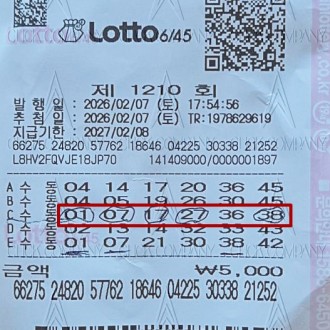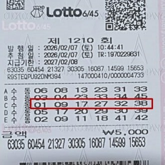 로또클릭 1210회차 동행복권 당첨번호2026-02-07 17917273831 1등 1,102,298,407원 당첨자수 23명 2등 28,818,259원 당첨자수 153명 3등 948,418원 당첨자수 4649명 동행복권 추첨방송 [ 1210회 ] - 2026년 02월 07일 방송 동행복권 사이트 바로가기