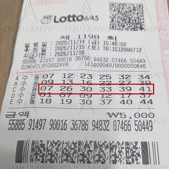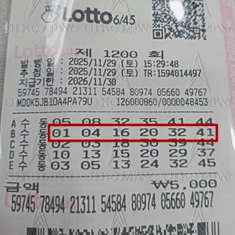로또클릭 1200회차 동행복권 당첨번호2025-11-29 12416203245 1등 2,357,299,875원 당첨자수 12명 2등 58,932,497원 당첨자수 80명 3등 1,315,458원 당첨자수 3584명 동행복권 추첨방송 [ 1200회 ] - 2025년 11월 29일 방송 동행복권 사이트 바로가기