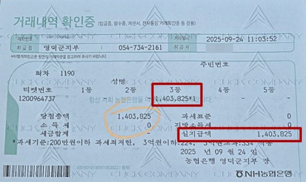 위 당첨 용지는 로또클릭에서 분석번호를 받아 당첨이 된 당사 회원에게 직접 전달 받았으며,