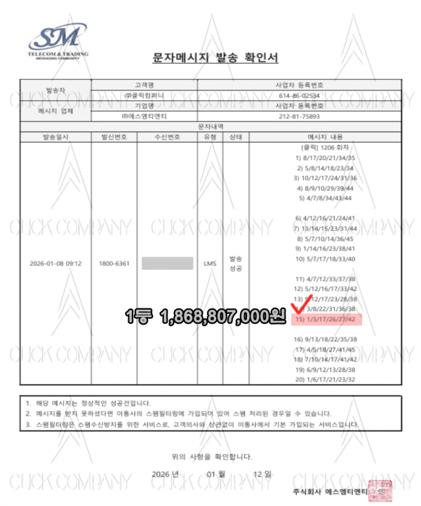 위 사진은 로또클릭에서 해당 회원에게 문자를 발송을 했다는 문자 발송 업체의 발송 내역 확인증이며,