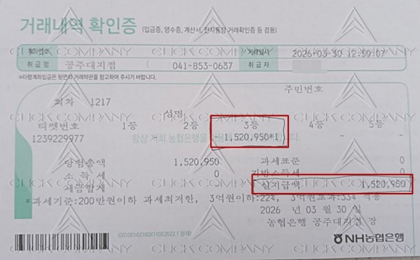 위 당첨 용지는 로또클릭에서 분석번호를 받아 당첨이 된 당사 회원에게 직접 전달 받았으며,