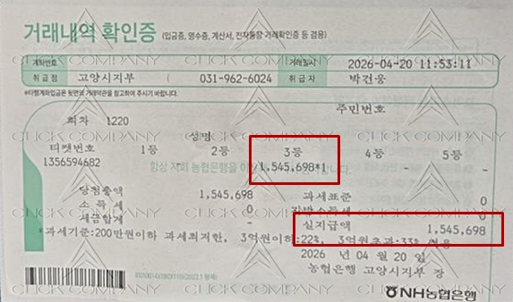 위 당첨 용지는 로또클릭에서 분석번호를 받아 당첨이 된 당사 회원에게 직접 전달 받았으며,